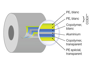 Se compose de plusieurs couches de PE dans lesquelles est implantée une barrière aluminium. Ce laminé se prête par conséquent tout particulièrement à la protection de matériaux de remplissage agressifs et à réaction rapide. La teinte aluminium est également souvent choisie comme élément décoratif.