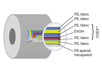Se compose de plusieurs couches de plastique, dans lesquelles une barrière EVOH (copolymère d’éthylène et d’alcool vinylique) est intégrée pour protéger les matériaux de remplissage. L’EVOH sert de barrière efficace pour de nombreux matériaux de remplissage courants dans les domaines des produits chimiques et ménagers, de l’hygiène buccale et des soins dentaires, des cosmétiques et de l’alimentation.